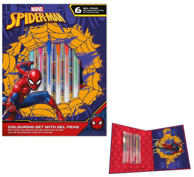 Spiderman, Pókember notesz + zselés toll szett Méret: 18,5x23 cm Tartalma: - 1 db notesz 16x21,5 cm (4 db színezhető képpel) - 6 db zselés toll Csomagolt termék, ajándéknak is kiválóan alkalmas.