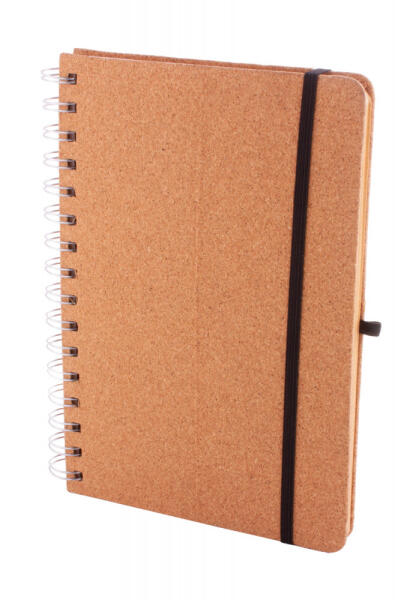 Természetes parafa borítású spirál jegyzetfüzet, búzaszalma műanyag telefon- és tablettartó betéttel. 70 újrahasznosított kraft papírból készült vonalas lappal, gumis pánttal és tolltartóval. A5 méretű.