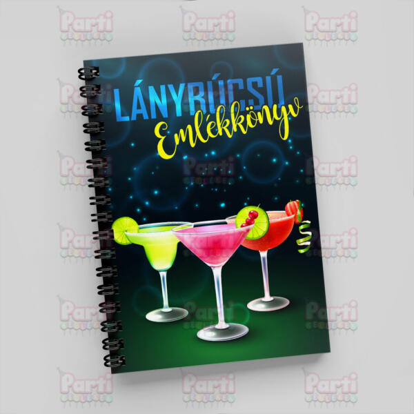 Koktélpoharas mintás emlékkönyv lánybúcsúra, fekete színű fém spirállal. Kedves lánybúcsú szervező! Legyen ez a legviccesebb, legragyogóbb és legegyedibb ünnepsége a menyasszonyodnak (és a résztvevőknek). Olyan buli, amire garantáltan mindenki sokáig emlékezni fog. Nem számít, hogy hol töltitek a lánybúcsút - otthon, mulatóban vagy a szabadban, mert a lényeg, hogy