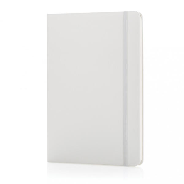 A5-ös méretű, vonalas jegyzetfüzet gumis pánttal, belsejében könyvjelzővel. 144 oldal (70g/m2). Krémszínű lapok.