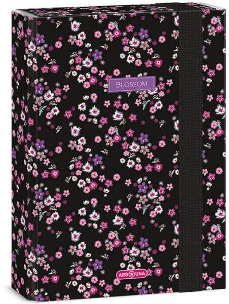 Fekete, apró rózsaszín virágos mintás, A5-ös méretű füzetbox lányoknak, hölgyeknek. Füzetek, iratok tárolására alkalmas. Kemény, tartós kartonból készült. Gumipántja 7 mm vastag. Méret: 22x, 3,5x16 cm. Minőségi Ars Una termék. Az Ars Una Pearl Blossom virágos teljes kollekció itt tekinthető meg >>