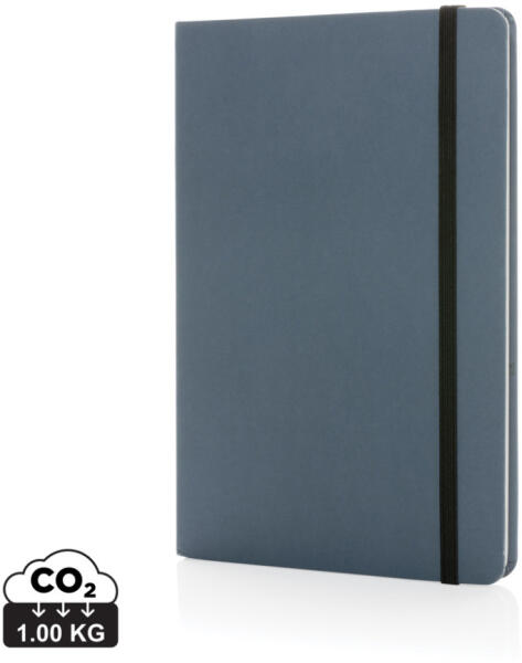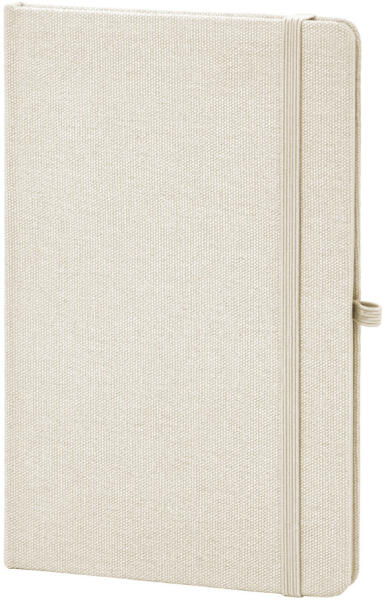Újrahasznosított pamut borítású jegyzetfüzet 80 vonalas lappal, újrahasznosított papírból. Megegyező színű könyvjelzővel, gumiszalaggal és tolltartóval. A5 méretű.