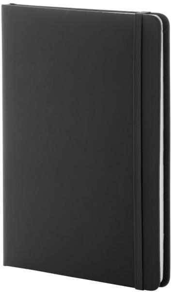 Újrahasznosított műbőr borítású jegyzetfüzet 100 vonalas lappal, újrahasznosított papírból. Megegyező színű könyvjelzővel és gumiszalaggal. A5 méretű.
