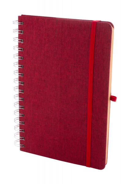 RPET poliészter borítású spirál jegyzetfüzet, búzaszalma műanyag telefon- és tablettartó betéttel. 70 újrahasznosított kraft papírból készült vonalas lappal, gumis pánttal és tolltartóval. A5 méretű.