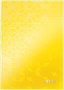 LEITZ WOW beírókönyv, keményfedelű, A4, vonalas, sárga A német LEITZ WOW termékcsaládjának tagjai otthon, irodában és az iskolában egyaránt praktikusan, sokoldalúan használhatók. A család jellegzetessége a geometrikus mintázatú, kartonból vagy félkemény műanyagból készült, strapabíró, erős borító környezetbarát, újrahasznosított vagy FSC tanúsítvánnyal rende