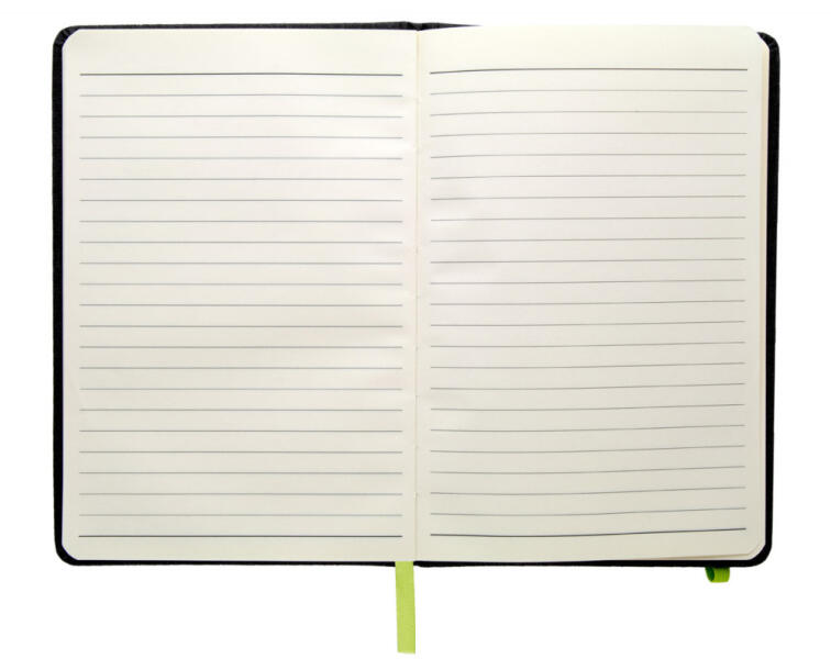 Műbőrrel borított jegyzetfüzet megegyező színű könyvjelzővel, gumiszalaggal és tolltartóval. 96 vonalas lappal, A5 méret.