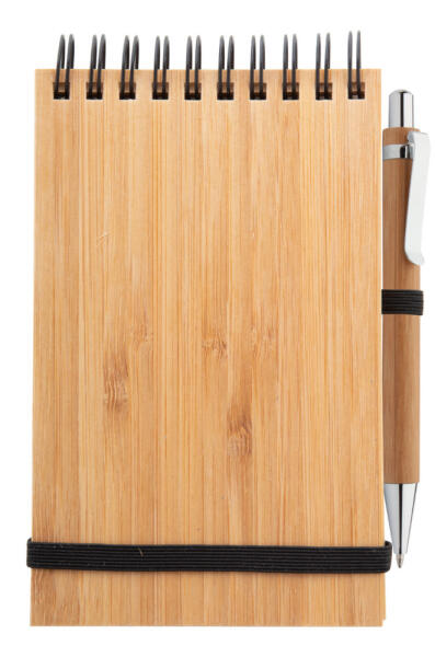 Bambuszból készült spirál jegyzetfüzet 70 vonalas lappal. Bambuszból készült golyóstollal, kék tollbetéttel szállítjuk.