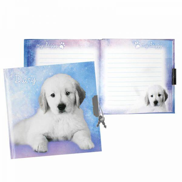 Édes fehér kutyás borítójú napló, mely kulccsal zárható. Lapjai vonalas. Mérete: 13,5x13,5 cm. Kedves ajándék születésnapra barátnőnek.