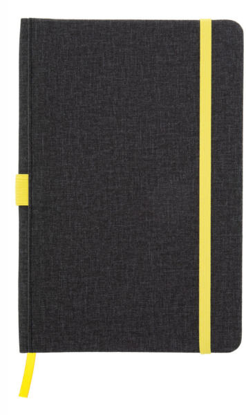 Műbőrrel borított jegyzetfüzet megegyező színű könyvjelzővel, gumiszalaggal és tolltartóval. 96 vonalas lappal, A5 méret.