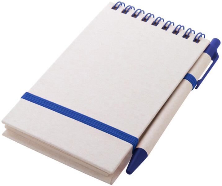 Újrahasznosított tejesdoboz anyagú spirálfüzet kemény borítóval és 70 vonalas lappal. Hozzáillő színű spirálgyűrűkkel, gumipánttal és tolltartóval. Újrahasznosított tejesdoboz és újrahasznosított ABS műanyag golyóstollal, kék tollbetéttel. A6 méretű.