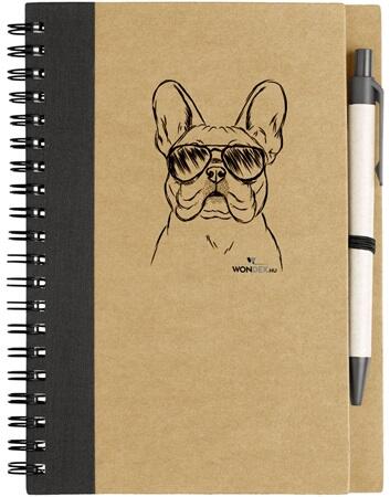 Újrahasznosított papír jegyzetfüzet varrott borítással, és 60 darab újrahasznosított kraft papír lappal. A6 méretű.