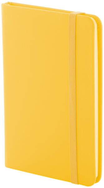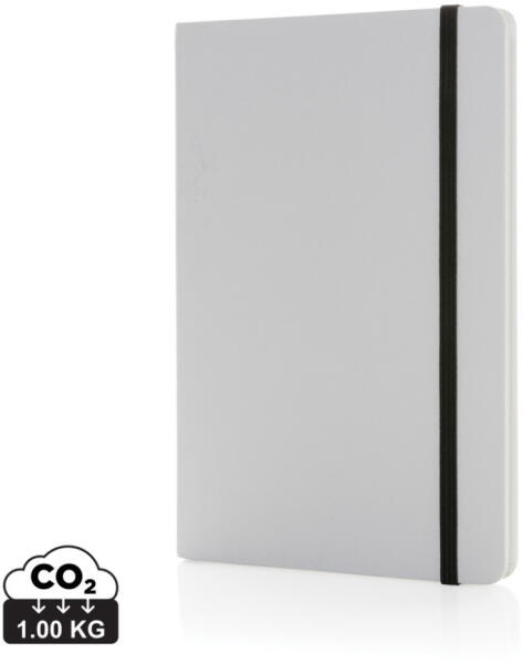 Újrahasznosított műbőr borítású jegyzetfüzet 100 vonalas lappal, újrahasznosított papírból. Megegyező színű könyvjelzővel és gumiszalaggal. A6 méretű.