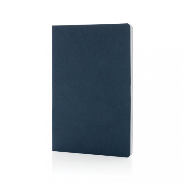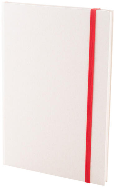 Újrahasznosított tejesdoboz anyagú jegyzetfüzet kemény borítóval és 80 vonalas lappal. Hozzáillő színű gumiszalaggal. A5 méretű.