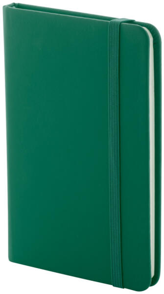 Újrahasznosított műbőr borítású jegyzetfüzet 100 vonalas lappal, újrahasznosított papírból. Megegyező színű könyvjelzővel és gumiszalaggal. A6 méretű.