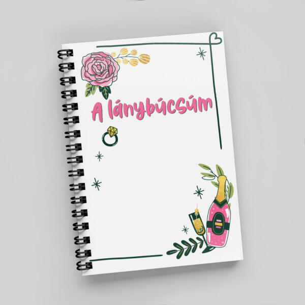 Emlékkönyv lánybúcsúra, fekete színű fém spirállal. A mintán kedves ábrák láthatók leánybúcsús témában, úgymint, jegygyűrű, pezsgő, rózsa, stb. Kedves lánybúcsú szervező! Legyen ez a legviccesebb, legragyogóbb és legegyedibb ünnepsége a menyasszonyodnak (és a résztvevőknek). Olyan buli, amire garantáltan mindenki sokáig emlékezni fog. Nem számít, hogy hol t