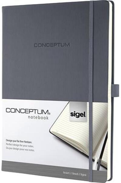 Jegyzetfüzet, exkluzív, A4, vonalas, 97 lap, keményfedeles, SIGEL "Conceptum", sötétszürke Az egyedül álló "Softwave" borító, a friss, modern színektől a sötétebb, visszafogottabb árnyalatokig több stílusban bűvöli el rajongóit. Ezáltal nyújt elegáns megjelenést mind az üzleti, mind a magánéletben. gumiszalaggal záródik oldalán tolltartóval belül sarokzseb és arch