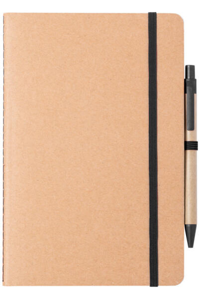 Újrahasznosított karton borítású jegyzetfüzet 60 sima lappal és színes gumipánttal, A5 méretű. Búzaszalma műanyag golyóstollal, kék tollbetéttel.
