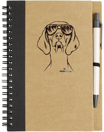 Úrahasznosított műbőr borítású jegyzetfüzet újrahasznosított papírból készült 100 sima lappal. Hozzáillő színű gumipánttal és könyvjelzővel. A6 méretű.