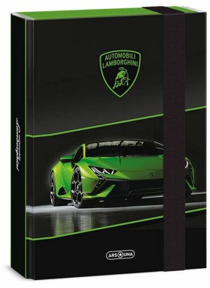 Zöld színű Lamborghini sportautó mintás A5-ös méretű füzetbox fiúknak, férfiaknak. Füzetek, iratok tárolására alkalmas. Kemény, tartós kartonból készült, külseje matt fóliával és 3D dombor formalakkal. Gumipántja 7 mm vastag. Méret: 22x, 3,5x16 cm. Minőségi Ars Una termék. Teljes Ars Una - Lamborghini kollekció >>