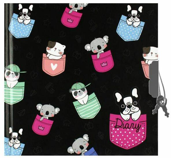 Cuki állatos borítójú napló, mely kulccsal zárható. Lapjai vonalas. Mérete: 13,5x13,5 cm. Kedves ajándék születésnapra barátnőnek. A napló borítóján édes állatok láthatóak: francia bulldog, koala maci, cica