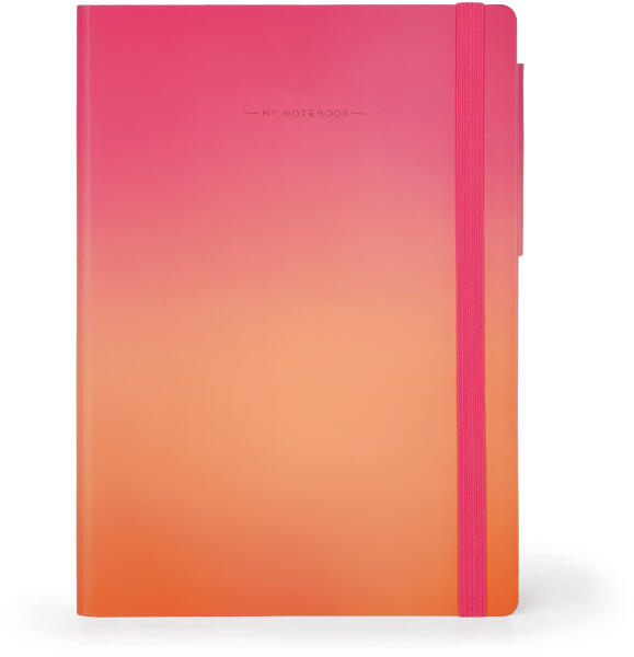 A5-ös méretű, kemény borítású, vonalas jegyzetfüzet gumipánttal és fekete könyvjelzővel. 144 krémszínű oldallal (70gr/m2).