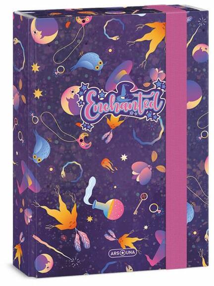 Különleges boszorkányos - varázslós motívumokkal díszített A5-ös méretű füzetbox lányoknak. Füzetek, iratok tárolására. Kemény, tartós kartonból készült. Gumipántja 7 mm vastag. Füzetek, iratok tárolására alkalmas. Méret: 22x, 3,5x16 cm. Színe: lila. Az Enchanted varázslós teljes kollekció itt tekinthető meg >>