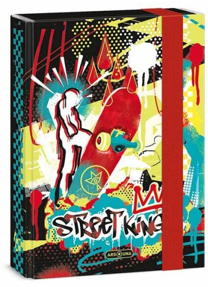 Gördeszkás street grafikájú A5-ös méretű füzetbox fiúknak. Füzetek, iratok tárolására alkalmas. Kemény, tartós kartonból készült, külseje matt fóliával és 3D dombor formalakkal. Gumipántja 7 mm vastag. Méret: 22x, 3,5x16 cm. Minőségi Ars Una termék. Válassz a teljes Ars Una - Street Kings gördeszkás kollekcióból >>