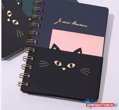 A5 Spirálos Cicás Notesz - Aranyozott és Vonalas Ez a cuki cicás spirálos notesz tökéletes választás mindennapi jegyzeteléshez, tervezéshez vagy naplóíráshoz. Könnyen hordozható, így bárhol kéznél lehet. A borító aranyozott részletekkel díszített, amely elegáns és modern megjelenést kölcsönöz. A vonalas belső lapok segítenek rendszerezni a gondolatokat, miközben a