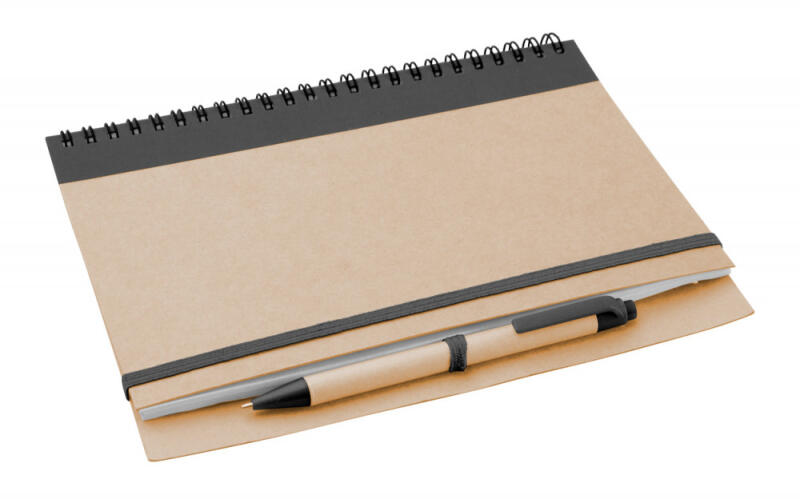 Újrahasznosított papírból készült spirálozott jegyzetfüzet 60 sima lappal, papír golyóstollal.