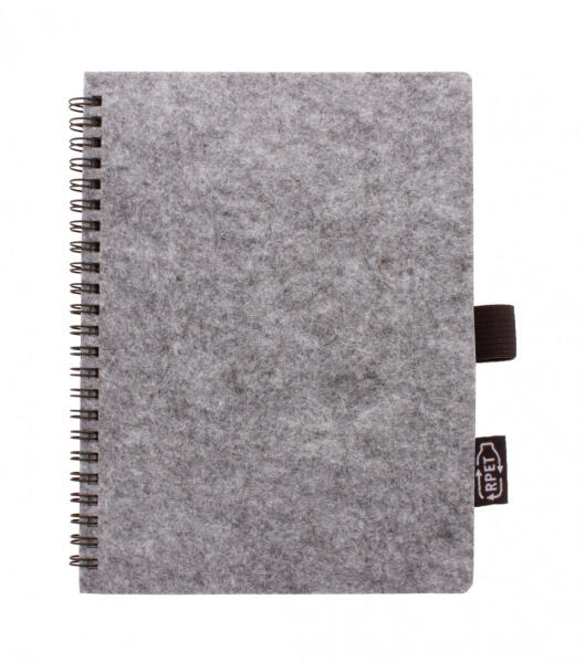RPET filc borítású spirál jegyzetfüzet, megkülönböztető RPET címkével és 80, újrahasznosított papírból készült vonalas lappal. A6 méretű.