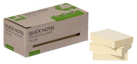 Öntapadós jegyzetfüzetek 100%-ban újrahasznosított papírból, súlya 70 g/m2. 12 darabos csomagolásban sárga színben. Méretek 38 x 51 mm.
