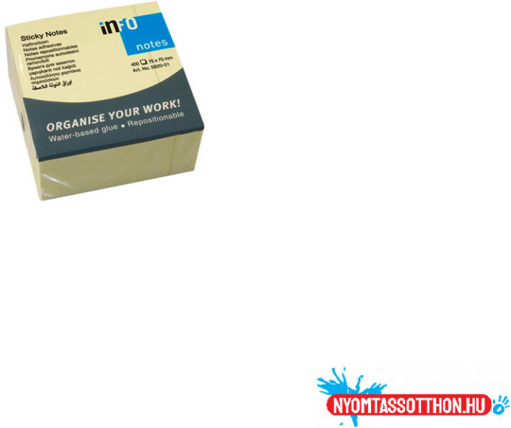 Jegyzettömb öntapadó, 75x75mm, 400lap, Info Notes sárga Ragad papíron és más felületeken Áthelyezhető, ragasztónyomokat nem hagy maga után A tömbről könnyen eltávolítható Vízbázisú, oldószermentes ragasztó Ideális rövid üzenetekhez, jegyzetekhez.