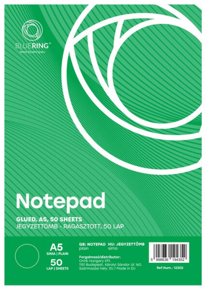 JEGYZETTÖMB A5 50LAPOS RAGASZTOTT SIMA 15X21CM, FELÜL RAGASZTOTT, 10DB/CSOMAG, 70gr Katalóguskód: 12302