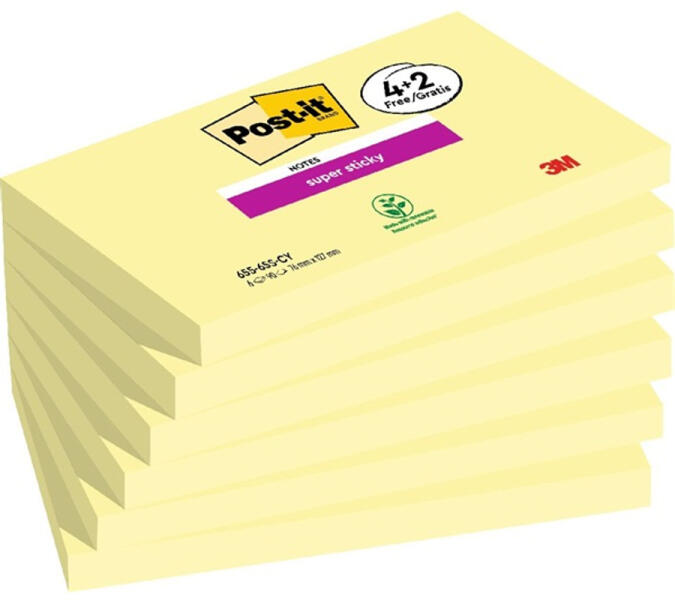 A Post-it® Super Sticky öntapadós jegyzettömbök kétszer erősebb tapadással rendelkeznek, mint az eredeti Post-it® jegyzettömb. Rendkívül erősek, sokoldalúak, és úgy tervezték őket, hogy kiemeljék az üzenetet. Kanárisárga színük ideális a jegyzetelésre, vagy üzenetek és emlékeztetők kihelyezésére. Super Sticky öntapadós jegyzettömb anyaga PEFC-tanúsítvánnyal re