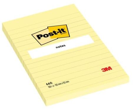 Sárga öntapadó párna nagy formátumban vonalakkal, strukturált jegyzetekhez és a szervezet egyszerűsítéséhez munka. Nagyobb csomag, 6 × 100 jegy. Méretek: 102 x 152 mm. Jegyek száma: 100 db. - A Post-it® nagy betétek ideálisak olyan helyzetekben, ahol egyetlen szabvány méretű alátét sem illik hozzád. - A Post-it® blokkok PEFC-tanúsítvánnyal rendelkező papírszálakból k