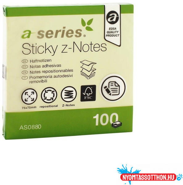 Jegyzettömb öntapadó, 75x75mm, 100lap, `Z` A-Series, sárga Ideális rövid üzenetekhez, jegyzetekhez. Szinte minden felületen tapad és könnyen visszaszedhető. Feltűnő élénk színű, hogy ne vesszen el az információ. Az adagolóból könnyen kihúzható. 12/csomag