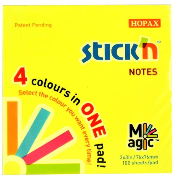 # A Magic Sticky Note színt visz az asztalodra. # Előnyös a jegyzetek és üzenetek színkódolásához. # Minden alkalommal kiválaszthatja a kívánt színt. # Használható otthon, az irodában, az iskolában vagy akár utazás közben is. # Méret: 76 x 76 mm # Szín: Sárga/kék/magenta/neonzöld # Csomagolás: 100 (4x25)lap/készlet
