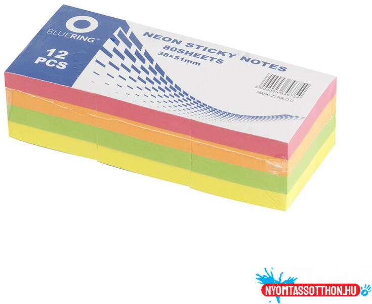 Jegyzettömb öntapadó, 38x51mm, 80lap, 12 tömb/csomag, Bluering® , neon Ideális rövid üzenetekhez, jegyzetekhez. Szinte minden felületen tapad és könnyen visszaszedhető. Élénk neon színekben, hogy ne vesszen el az információ.