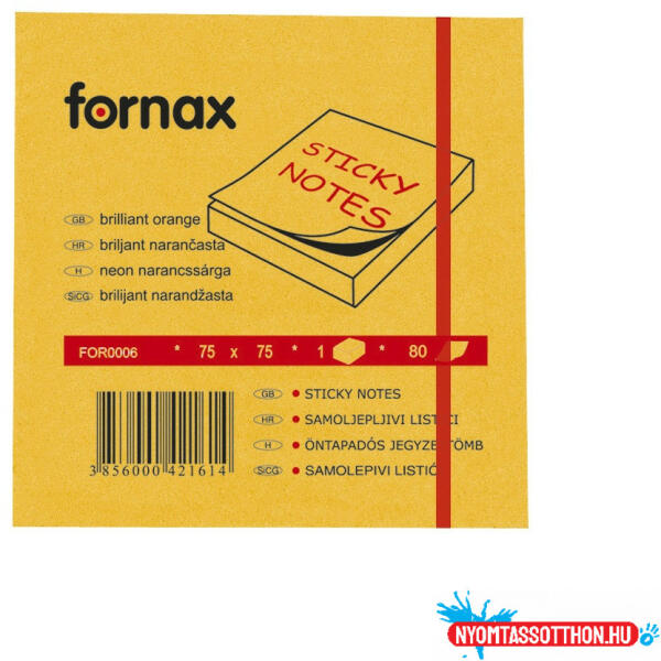 Jegyzettömb öntapadó, 75x75mm, 80lap, Fornax neon narancs Ideális rövid üzenetekhez, jegyzetekhez. Szinte minden felületen tapad és könnyen visszaszedhető. Feltűnő élénk színű, hogy ne vesszen el az információ.