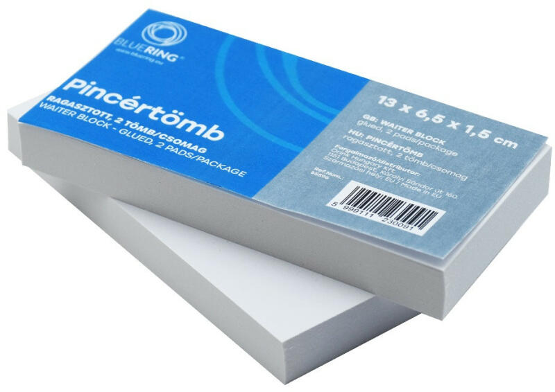 Jegyzettömb: 70 gm-os fehér papírból készült, felső részén ragasztott, 50 lapos. Méret: 90X145 mm.