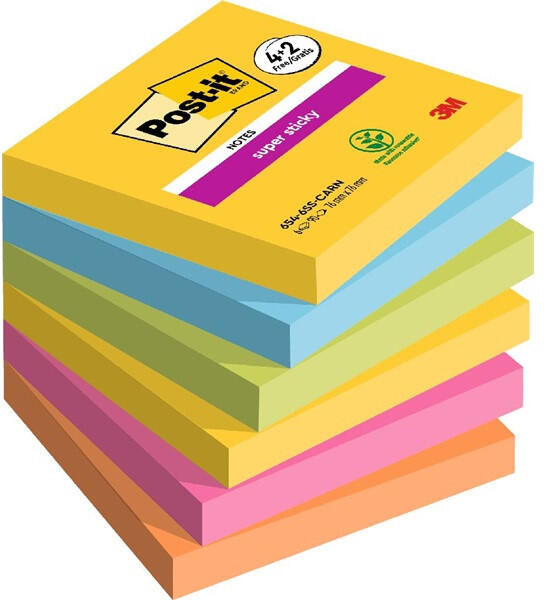 Post-it Super Sticky Carnival 76x76mm 90lapos 4+2db vegyes jegyzettömb A Post-it® Super Sticky öntapadós jegyzettömbök kétszer erősebb tapadással rendelkeznek mint az eredeti Post-it® jegyzettömb. Rendkívül erősek, sokoldalúak, és a különböző lágy, világos és élénk színeik kiemelik az üzenetét. Erősebben és hosszabban tapadnak, az eredeti Post-it® jegyzettömbökkel