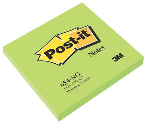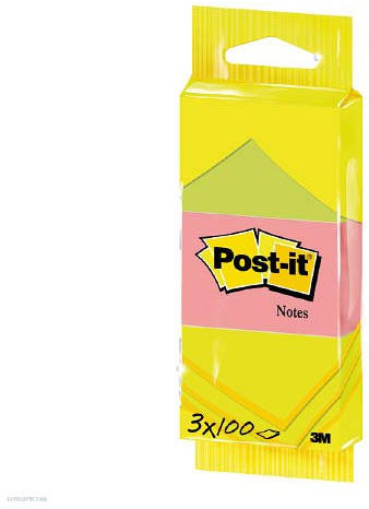 Post-it® jegyzettömb csomag vegyes neon színekben (zöld, rózsaszín, sárga). 3 x 100 lapos, 51 × 38 mm méretben, bliszteres csomagolásban. .