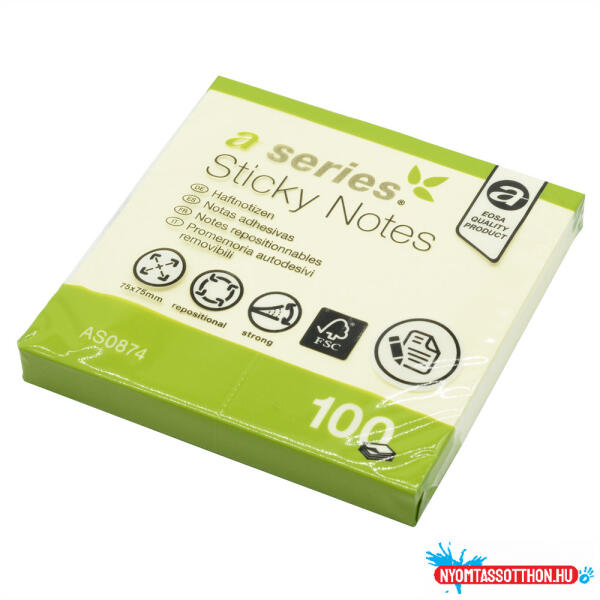 Jegyzettömb öntapadó, 75x75mm, 100lap, A-Series, sárga Ideális rövid üzenetekhez, jegyzetekhez. Szinte minden felületen tapad és könnyen visszaszedhető. Sárga színben.