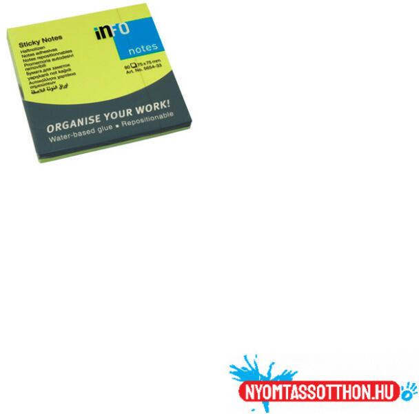 Jegyzettömb öntapadó, 75x75mm, 80lap, Info Notes brilliant zöld Ragad papíron és más felületeken Áthelyezhető, ragasztónyomokat nem hagy maga után A tömbről könnyen eltávolítható Vízbázisú, oldószermentes ragasztó Ideális rövid üzenetekhez, jegyzetekhez.