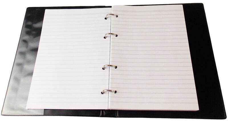 A gyűrűs dosszié borítója műanyagból készült, 100 darab vonalas, A5-ös méretű lapot tartalmaz. gyűrűs dosszié gyűrűs szerkezet 100 lapos, vonalas betéttel együtt kerül szállításra anyag: műanyag szín: fekete formátum: A5