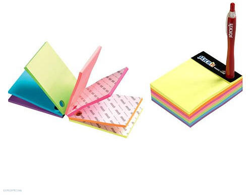 Szabadalmaztatott termék. Bármely szín kivehető a tömb szétesése nélkül. Színenként legyezőben szétnyíló tömb, vegyes neon színekben, ceruzatartóval. Leválasztható a teljes lap, illetve a perforáció mentén a lyuk nélküli rész is. .