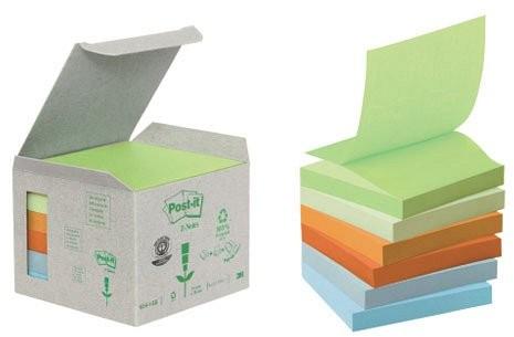 A népszerű egykezes Z-jegyzettömbök ezentúl környezetbarát formában is elérhetők. Újrafelhasznált karton kínálóban. Vegyes színű, 76 x 76 mm címkék. .