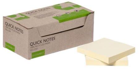 Öntapadós jegyzetfüzetek 100%-ban újrahasznosított papírból, súlya 70 g/m2. 12 darabos csomagolásban sárga színben. Méretek 76 x 76 mm.