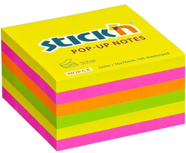Stick`N 76x76 mm 100 lap/tömb (6 tömb/csomag) neon mix öntapadó jegyzettömb Z-hajtott jegyzettömbök feltűnő, neon színekben. 6 db 100 íves tömb egy csomagban, 4 színben (2 x sárga, 2 x magenta, 1 x narancs, 1 x lime) Egyszerűen felhelyezhető és ragasztómaradvány nélkül eltávolítható. Kiválóan tapad műanyagra, kartonra, üvegre, papírra és még sok más felületre.
