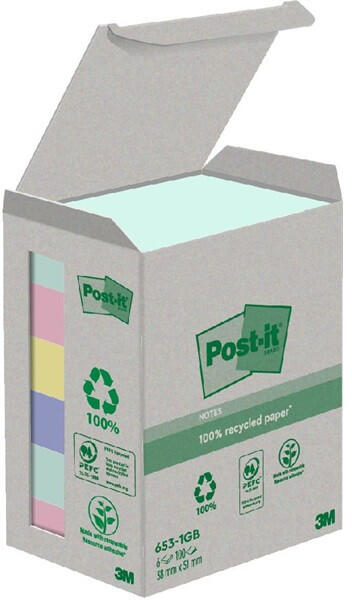 Post-it 38x51mm újrahasznosított 100lapos 6db vegyes jegyzettömb Az újrahasznosított Post-it® jegyzettömbök 100%-ban újrahasznosított papírból és megújuló forrásból származó ragasztóval készülnek (a ragasztó 60%-banévelő növényből készül). A jegyzettömbök PEFC RECYCLED minősítéssel rendelkeznek, és minősített, megújuló és felelős erdőgazdálkodásból sz